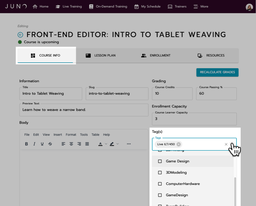 At this time, you can only select from tags created in the new JUNO LMS. This is because we are building the new LMS on an upgraded database. Those tags are not synced with the rest of your existing database, which causes some limitations. For example: